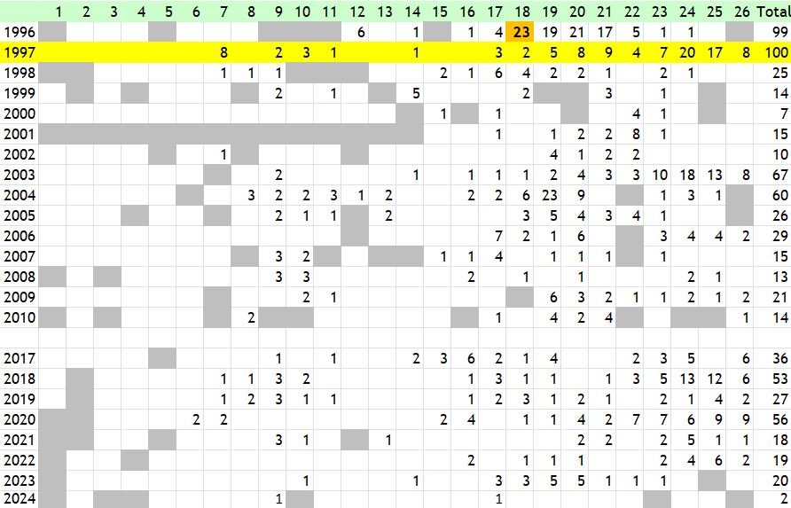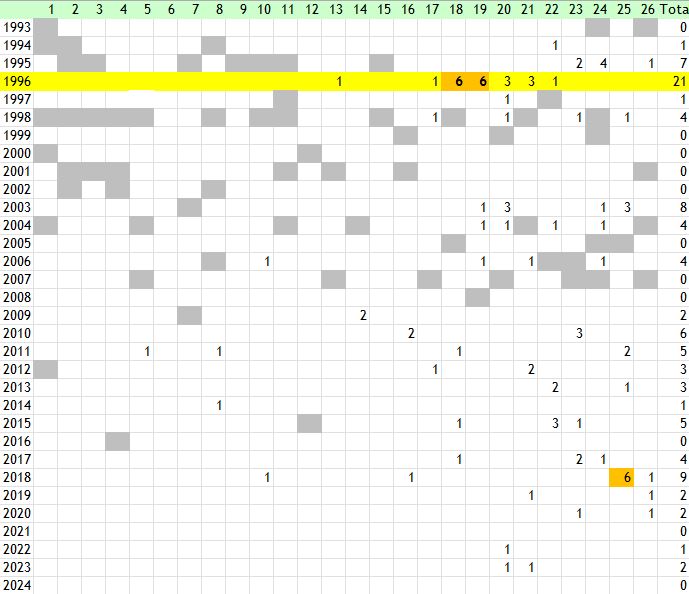 As indicated on the map the Small Copper is widely distributed in the Stevenage area although there are no records from the TL22Z tetrad (north of Cromer) since 1995. Reasonable sized colonies can be found in Knebworth Park, near Watery Grove, Great Ashby Park and Frogmore Gravel Pit. The peak count of 23 was achieved at Knebworth Park on 17 August 2004. Inclement weather in the first half of 2024 impacted the butterfly's progress with only 54 specimens reported making the year the worst since 2016.