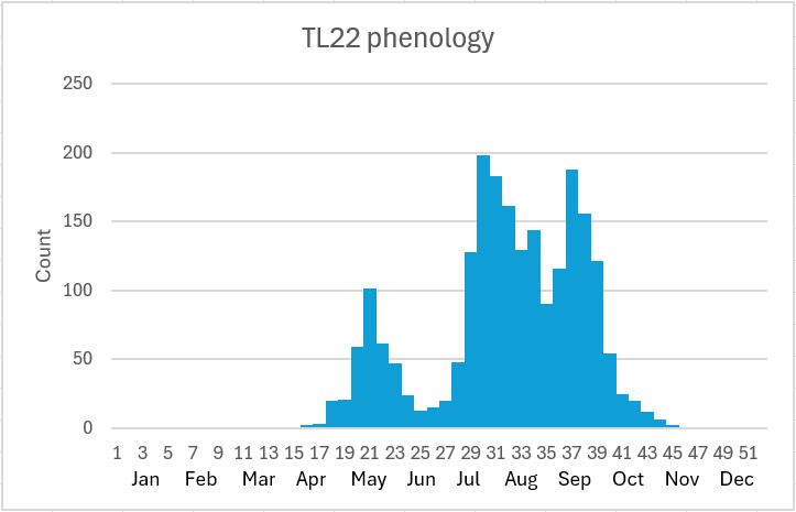 three generations a year with peaks in late May, first half of August, and September and early October. Very occasionally a partial fourth brood emerges