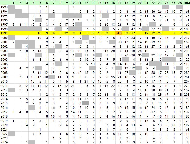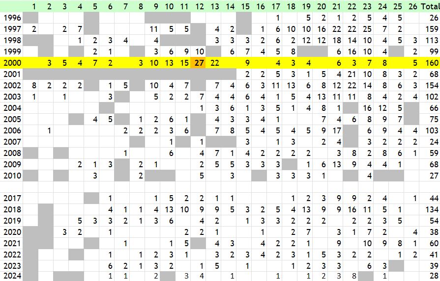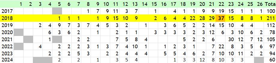 As indicated on the map, the Speckled Wood occurs in every tetrad in the Stevenage area. Whomerley Wood is one of the best places to find it although the butterfly is not as common as it used to be, owing to lack of management of the rides which are now too overgrown and shady. Numbers built up across the area since the late 2000s to reach a peak in 2018 but have reduced steadily since then. Poor weather in 2024 hampered progress even further for this butterfly with abundance lower still and figures suggest the worst year since 2015.