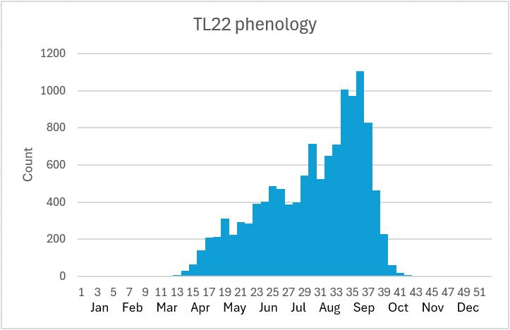 the first week of May, middle of June, late July and late August/early September. Nevertheless, in suitable areas, it may be seen in every week between