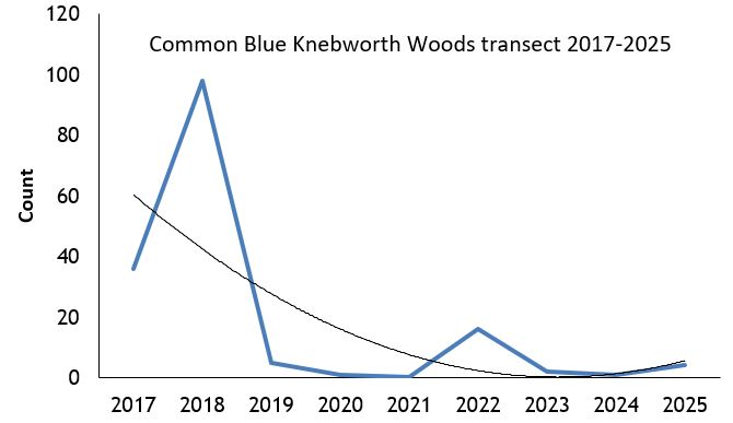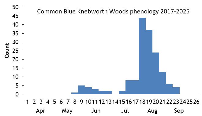 The Common Blue is widespread and common except on the mountainous areas in Scotland and Wales. Both range and abundance have declined slightly since 1976 but have stabilised since 2005 (Fox et al.) although a worrying decline has occurred since around 2015. It is thought that many colonies were lost in the arable areas of eastern England through farming intensification in the last few decades of the 20th century (Asher et al.). In Hertfordshire and Middlesex, it is still a common butterfly and although populations are smaller than the 1990s it is colonising new sites even in urban areas. The 1990s saw an increase in numbers until 1998 when it suffered badly probably due to the wet weather in June that year. Since 2003, it has recovered well both in range and abundance despite the run of poor summers in the middle of the 2010s. 2018 saw substantial increases in numbers at many locations but the trend is generally negative.