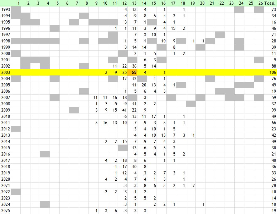 in June with a long season lasting until the middle of August. The last week of June is the peak period as indicated on the chart. The eggs are laid beneath