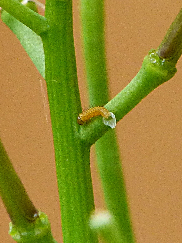 14 May - Orange-tip larva emerges. Orange-tip caterpillar emerges from egg - see photo. Unfortunately, hours later not to be seen anywhere on the plant