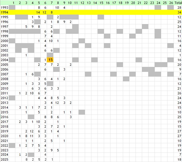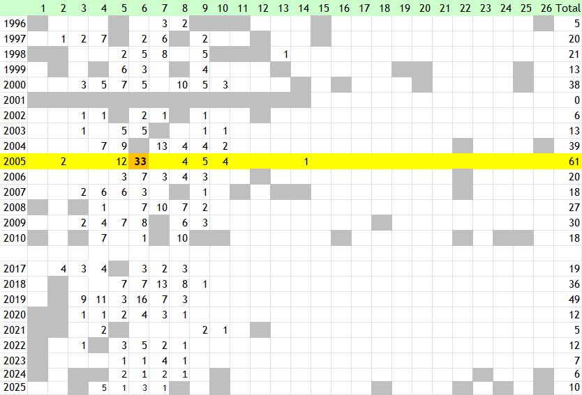 The Orange-tip is present in every tetrad as shown on the map. The largest concentrations appear to be in the Knebworth woods complex, Fairlands Valley Park and the field north of St Nicholas Church. The highest count of 33 was recorded by Ken King on his Knebworth Park transect on 9 May 2005. In 2019, the balmy weather in February saw emergence on 24 March in a Stevenage garden, beating the previous first sighting date by seven days. Unsurprisingly, the flight season ended early with only two records in June. Numbers were slightly below average in 2023 and 2024 doubtlessly can be explained due to inclement weather in the spring.