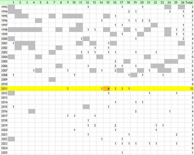 As indicated on the map, the butterfly is well distributed in the Stevenage area. The highest populations recorded were in Old Stevenage: 17 at St. Nicholas Churchyard on 14 September 2011 and 15 at Great Ashby on 4 August 2021. The map shows that the TL22L tetrad harbours the largest total because proportionately many more visits were made to this tetrad over the whole survey period. 2023 was easily the best year for number of reports (420) with the highest ever counts too including 46 in central Stevenage on 16 July.