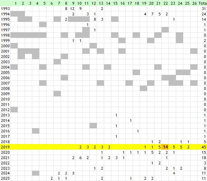 As shown on the map, the Small Heath occurs in the majority of tetrads in the Stevenage area but curiously the tetrads indicating absence contain grassy habitats which might be suitable for the butterfly. Observations indicate that 2019 was the best year on record with good numbers throughout the flight season but there has been a slight decline since then.