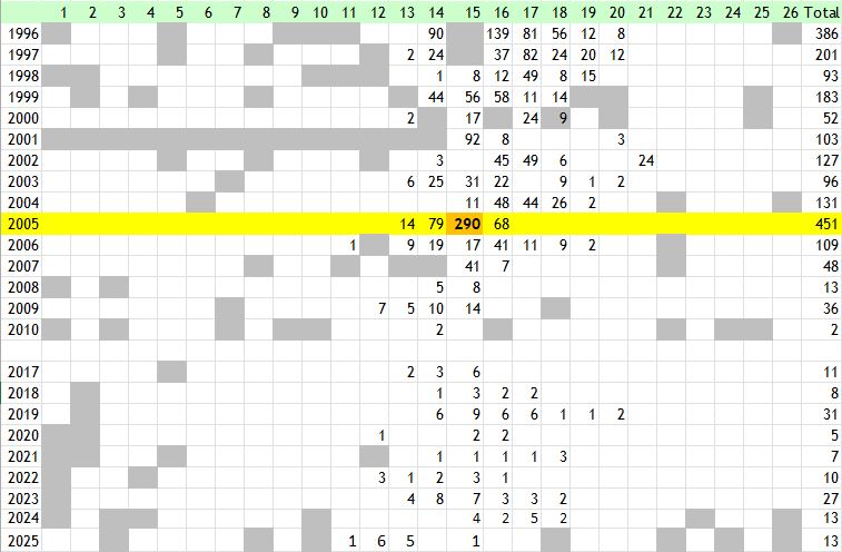 The map indicates that the species is well distributed in the area but as noted above, numbers have fallen since the beginning of the century although they grew since the poor 2010-12 period. There are no reports from two tetrads since before 2010: TL22N (St Nicholas & Chesfield Park) and TL22Z (Luffenhall). Fairlands Valley Park, Great Ashby Park and Knebworth Park are the best places to find this species. Inclement weather early in 2024 reduced numbers so much that it proved to be the worst year for this species since 2013.