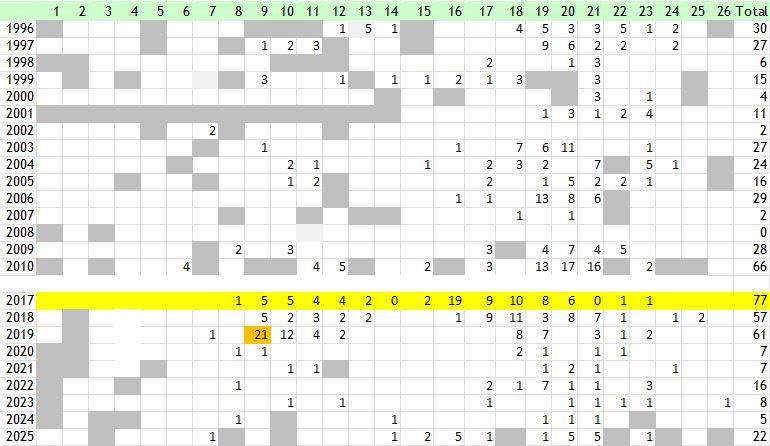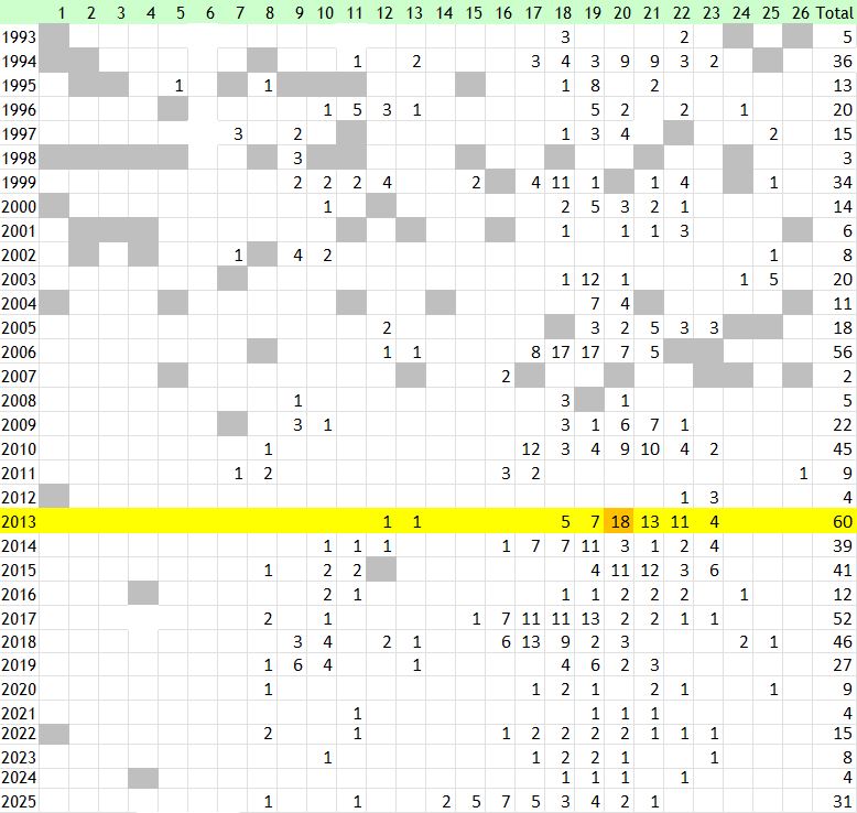 Earliest date: 5 May 1995 at Shackledell Grassland