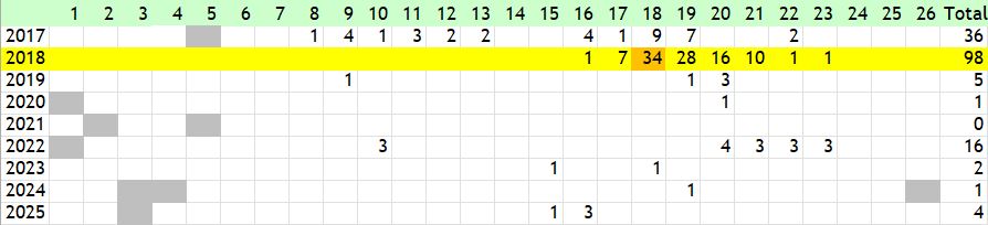 As indicated on the map, the butterfly has been found in every tetrad in the Stevenage district although in most places numbers are usually quite low. The best sites are Frogmore Gravel Pit, the western part of Knebworth Park, Great Ashby Park, Shackledell Grassland and the field adjoining Watery Grove. In 2018 the brownfield site at Arlington Business Park off Six Hills Way near the A1 attracted good numbers, e.g. 59 on 9 June. In fact, 2018 proved to be the best year during the survey period with 161 reports including several in September and October. However, since that bumper year, fortunes have changed dramatically with far fewer specimens seen and in 2024 not one site yielded more than 5 specimens on any one visit.
