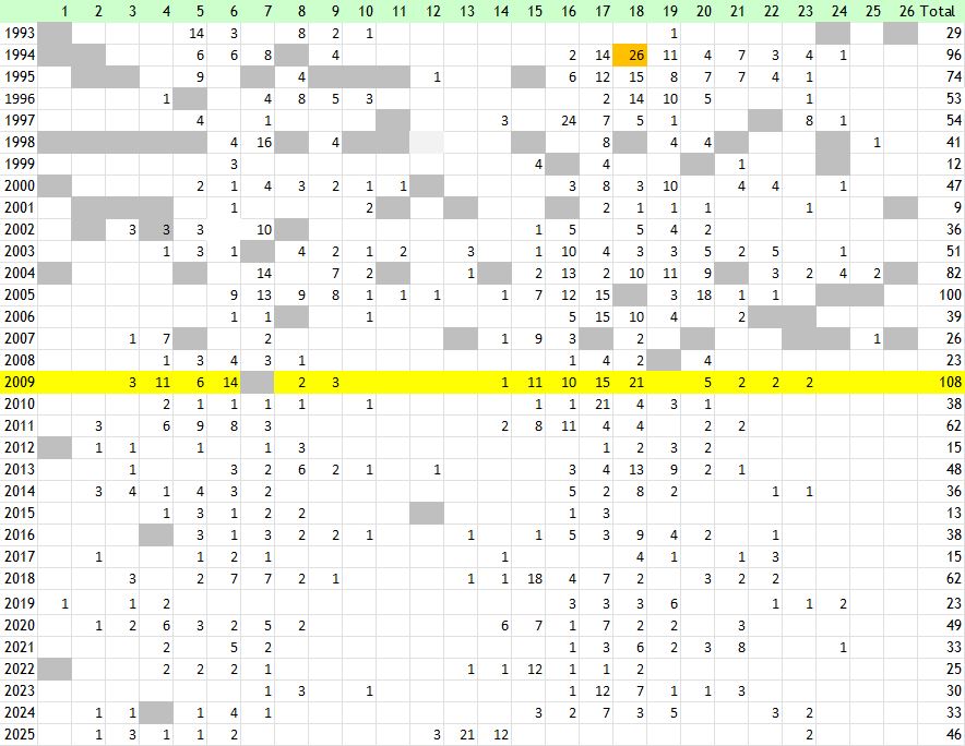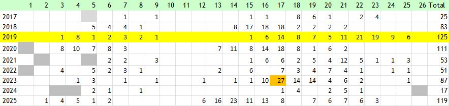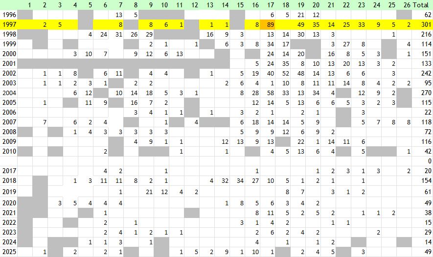The Green-veined White occurs in every tetrad as shown on the map. Numbers have declined dramatically since the mid-2000s. In 2004, 58 were counted at Knebworth Park by Ken King on 24 July but the highest counts were obtained in the Weston area in 1997 with 112 at Franklins Farm on 2 August and 100 at Cherrys Farm on 19 August. As already noted above, it is unknown why there is such a decline although numbers in 2018 bucked the long-term trend. 2024 was a relatively poor year with both spring and summer broods producing fewer specimens than usual.