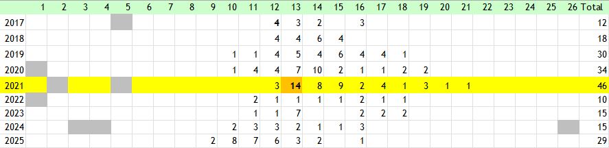 The butterfly is widely distributed in the Stevenage area as indicated on the map although it is apparently absent in several tetrads, notably TL22J (north Graveley) which is possibly due to lack of recorder effort. The area north of Graveley is mostly open farmland but there may be some sheltered spots near Roxley Court which might be suitable. There are no records for TL22C and TL22Y, areas predominantly agricultural, since before 2010, but there may still be suitable pockets of taller grassland. Numbers have been relatively stable in the last few years unlike the decline of the other golden skippers although 2024 saw a slight fall in numbers. In 2023, 79 individuals were counted during a Wider Countryside Butterfly Survey on 10 July - a record. The best sites are Fairlands Valley Park and Great Ashby Park. Like the Small and Essex Skippers, nectar sources are important for females to develop their eggs (Field et al.).