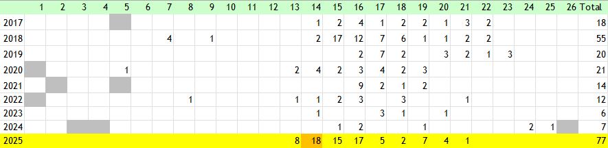 The Large White is present in every tetrad as indicated on the map. The larger parks in the district namely, Fairlands Valley Park, Knebworth Park and Great Ashby Park, attract the highest populations. Ken King counted 73 specimens on 24 July 2004 in his Knebworth Park transect and I estimated at least 50 at Norton Green on 1 August 2013. 2021 received the highest number of reports during the survey with a total of 264 from which a large majority was submitted to the Big Butterfly Count scheme during the peak of the butterfly's flight season. 2024 was a relatively poor year with far more reports from July onwards but 21 specimens were counted on 11 May near St Paul's Walden.