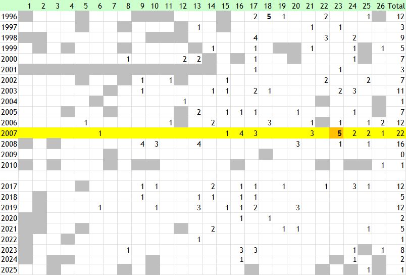 As indicated on the map, the butterfly is well distributed in the Stevenage area. The highest populations recorded were in Old Stevenage: 17 at St. Nicholas Churchyard on 14 September 2011 and 15 at Great Ashby on 4 August 2021. The map shows that the TL22L tetrad harbours the largest total because proportionately many more visits were made to this tetrad over the whole survey period. 2023 was easily the best year for number of reports (420) with the highest ever counts too including 46 in central Stevenage on 16 July.