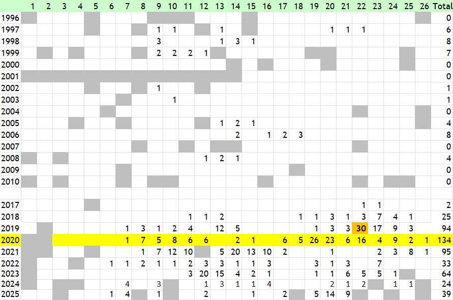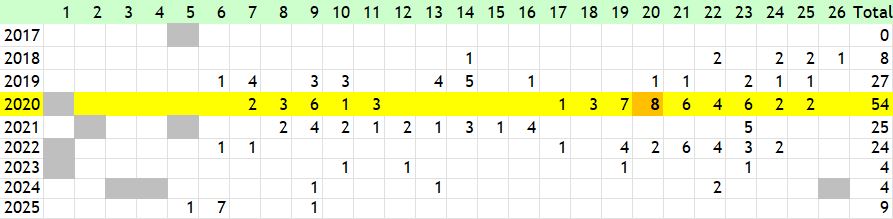 As shown on the map, the Small Heath occurs in the majority of tetrads in the Stevenage area but curiously the tetrads indicating absence contain grassy habitats which might be suitable for the butterfly. Observations indicate that 2019 was the best year on record with good numbers throughout the flight season but there has been a slight decline since then.