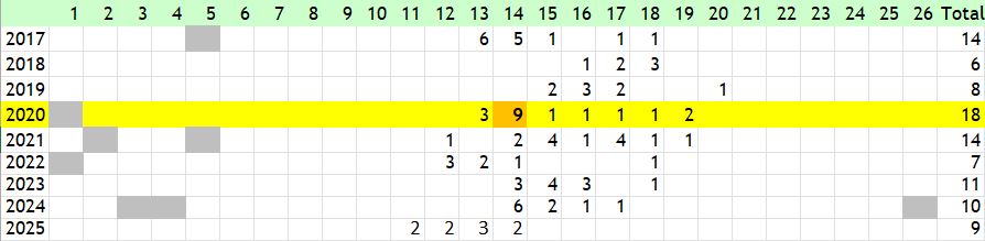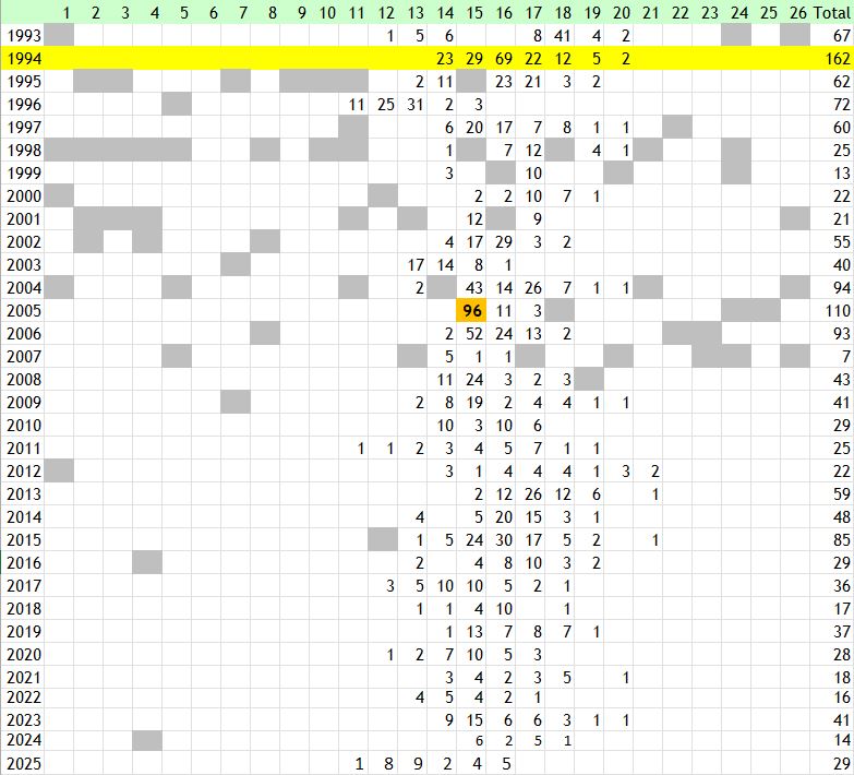 The map indicates that the species is well distributed in the area but as noted above, numbers have fallen since the beginning of the century although they grew since the poor 2010-12 period. There are no reports from two tetrads since before 2010: TL22N (St Nicholas & Chesfield Park) and TL22Z (Luffenhall). Fairlands Valley Park, Great Ashby Park and Knebworth Park are the best places to find this species. Inclement weather early in 2024 reduced numbers so much that it proved to be the worst year for this species since 2013.