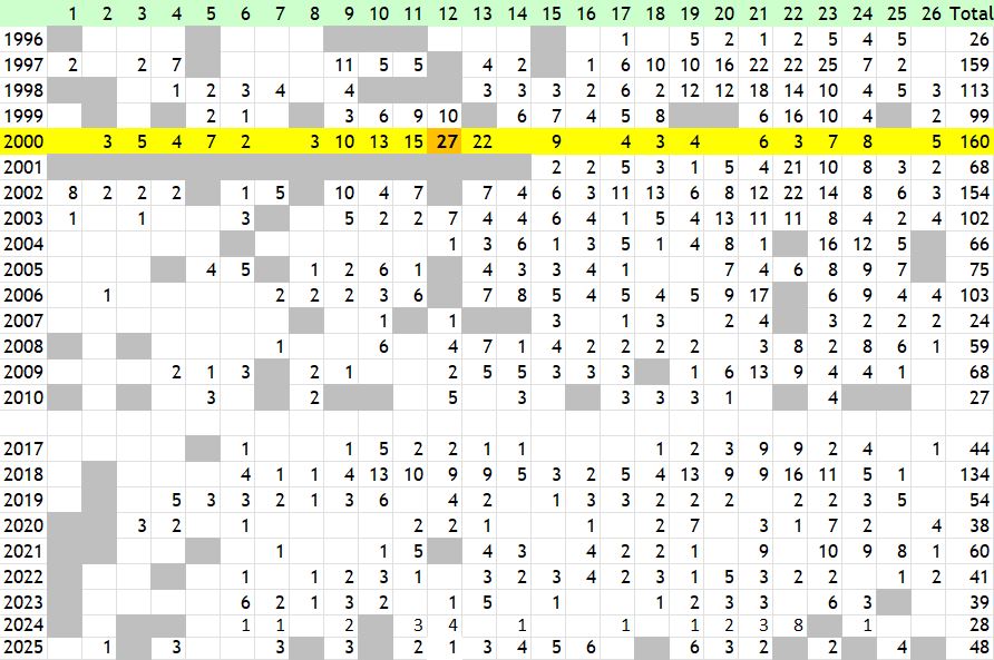 the first week of May, middle of June, late July and late August/early September. Nevertheless, in suitable areas, it may be seen in every week between