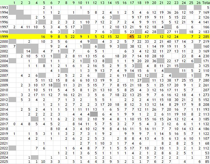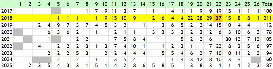 As indicated on the map, the Speckled Wood occurs in every tetrad in the Stevenage area. Whomerley Wood is one of the best places to find it although the butterfly is not as common as it used to be, owing to lack of management of the rides which are now too overgrown and shady. Numbers built up across the area since the late 2000s to reach a peak in 2018 but have reduced steadily since then. Poor weather in 2024 hampered progress even further for this butterfly with abundance lower still and figures suggest the worst year since 2015.